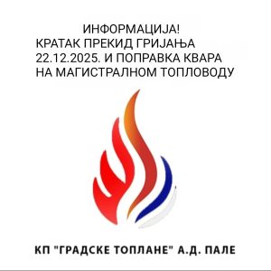 Сутра, 22.12.2025. године, због отклањања квара на магистралном топловоду (Светосавска улица), доћи ће до кратког прекида гријања корисницима у ужем урбаном дијелу Пала.